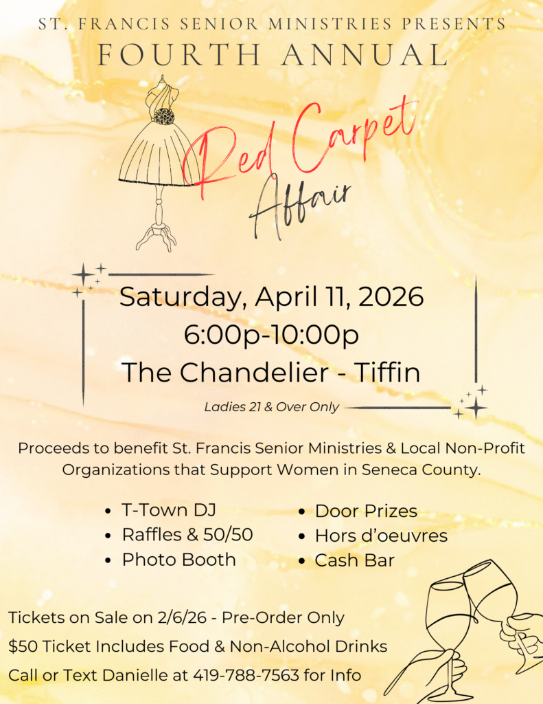 St. Francis Senior Ministries is excited to host its Fourth Annual Red Carpet Affair, an elegant evening dedicated to celebrating women while supporting meaningful causes in Seneca County. This special night invites guests to dress up, enjoy great company, and walk the red carpet for a purpose.